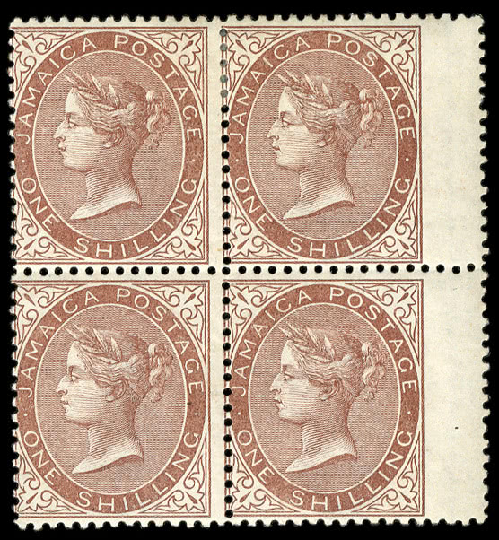 South West Africa: 1927-30 1s. brown and deep blue, mint block of four from the top of the sheet, one with variety no stop after “A”, fine. S.G. 64ba, cat. £1,500. Photo.