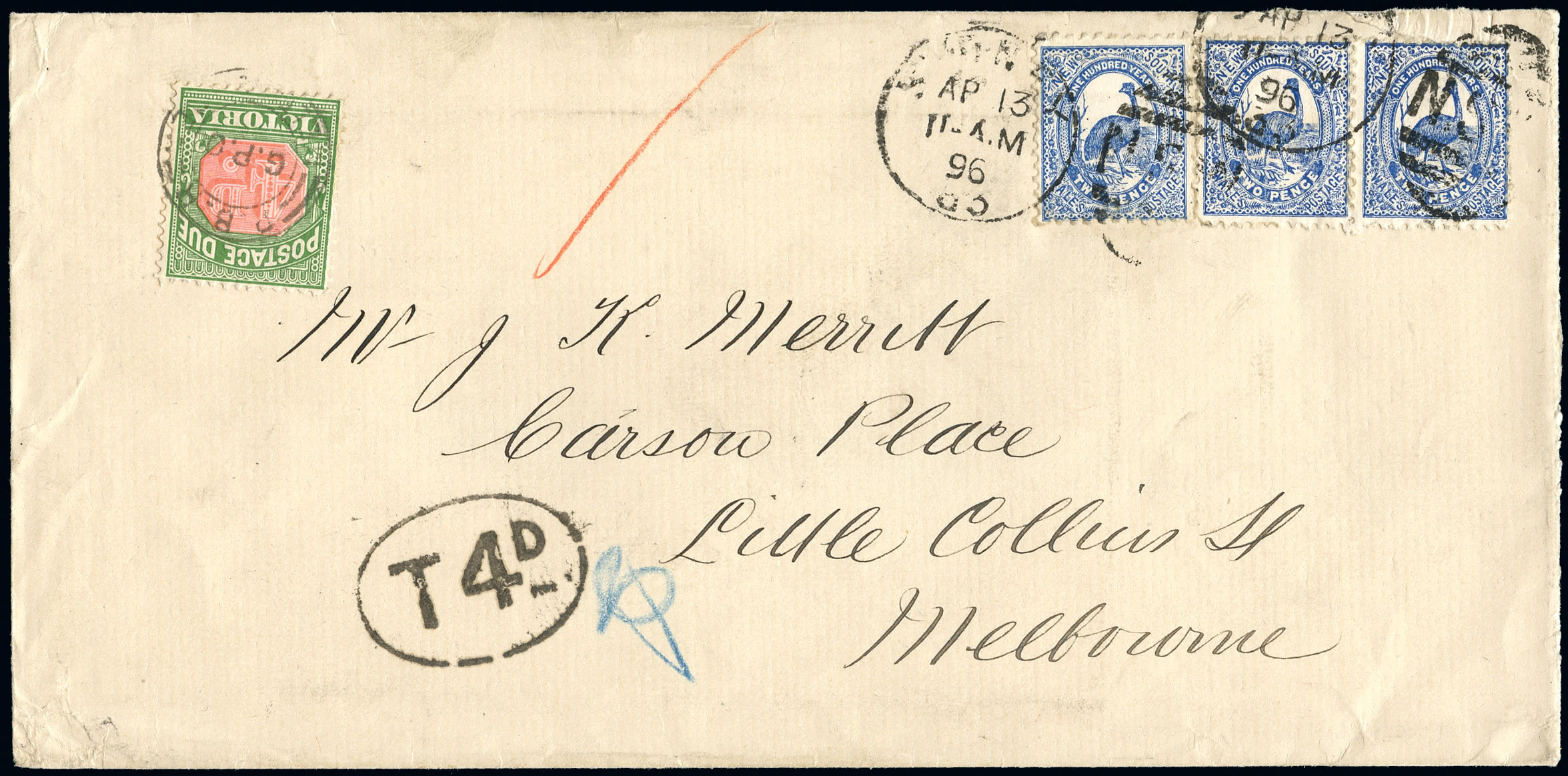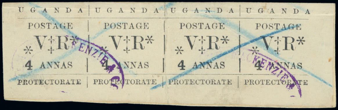 Uganda: Cancellations and Covers: Forwarding Agents: 1896 Type-Set 4a. lower marginal horizontal strip of four on small piece cancelled by two blue crayon crosses and showing ''KENZIE & CO'' two lightly struck part strikes of violet oval handstamps of Smith Mackenzie & Co. forwarding agents, central vertical crease and lighter horizontal crease at top. S.G. 58. Photo.