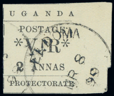 Uganda: Cancellations and Covers: British Vice Consul's Seal, 1896 Type-Set, ''L'' Overprint 1r., marginal example showing small ''o'' in ''POSTAGE'' [R. 3/1], cancelled by part strike of seal, fine and rare. S.G. 75a, cat. £2,000 as unused. R.P.S. certificate (1996) Photo.