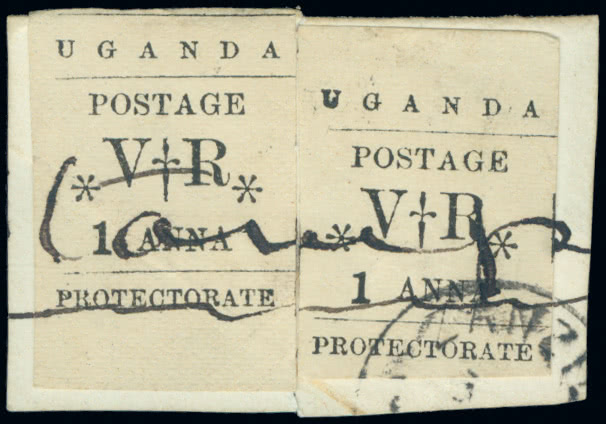Uganda: Cancellations and Covers: British Vice Consul's Seal, 1896 Type-Set 1r. on yellowish paper, tête-bêche pair cancelled by two strikes (one large part) of the seal, tiny thin in margin between. Rare, the sheets of the rupee values having been normally cut in half and issued in single panes of sixteen. S.G. 60 var. With R.P.S. certificate (2005) and separate handwritten opinion from Patrick Pearson FRPSL, RDP, Chairman of the committee. Photo.
