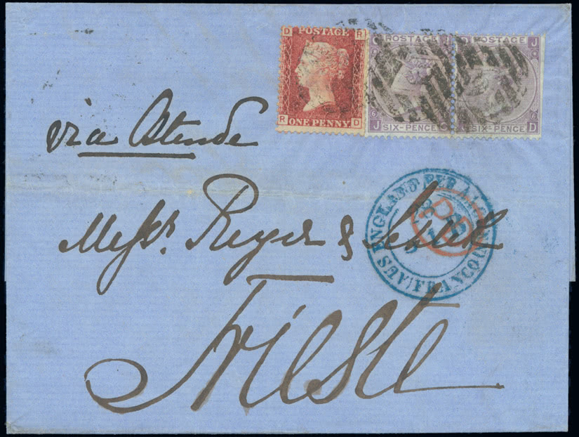Zanzibar: India used in Zanzibar: Type Z2 duplex: A good strike cancelling 1866-78 4a. blue-green, die II and 1873 1/2a. blue on small envelope to England backstamped Aden Aug. 7 transit and Bedford arrival, vertical fold at left and slight toning nevertheless attractive. S.G. Z14, Z16. Photo.