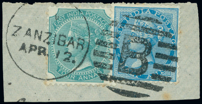 Zanzibar: India used in Zanzibar: Type Z5 squared circle (three bars at corners): A selection of mainly fair to fine strikes, most with clear dates incl. 1865 2a. brown-orange ''DE 15/87'' (slightly stained perfs.), 1873 1/2a. blue ''OC -/87'' (rounded corner), 1876 6a. ''AU 14/90'', 1882-90 1/2a. to 1r. (3, incl. a pair) less 9p. and 12a. but with additional 1/2a. strip of three, 1a. pair and 2a. strip of three, 1891 21/2a. on 4a.6p. (5, incl. two pairs), 1892-95 2a.6p. (7, inc. a strip of three and a pair), and a fine strike cancelling India 11/a. stationery card used ''JL 31/88'' to Berlin, most good to fine. (31 + 1 card)