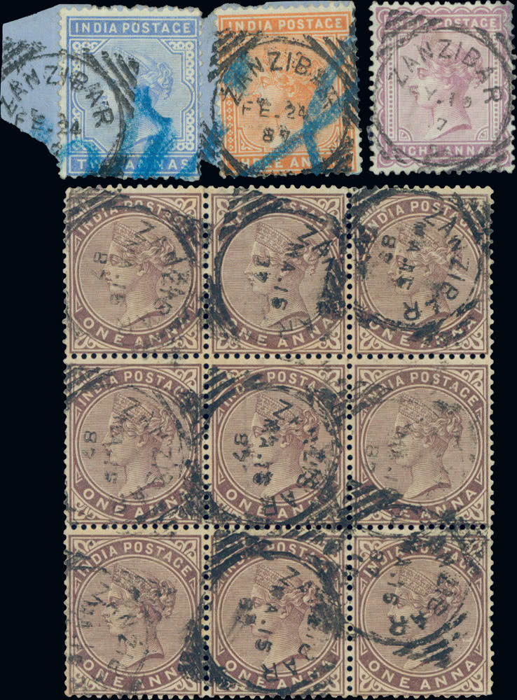 Zanzibar: India used in Zanzibar: Type Z5 squared circle (three bars at corners): An exceptional and extensive collection of mainly fair to fine strikes on the 1882-90 issues, comprising 1/2a. blue-green (59 incl. three pairs and two strips of three), 9p. aniline carmine (21, incl. two pairs, one used on piece with 1/2a. pair), 1a. brown-purple (66 incl. four pairs and two blocks of four), 1a.6p. sepia (59 incl. two singles used on pieces with 1a. and another with 1/2a. pair), 2a. blue (53 incl. three pairs and singles and three singles used on pieces with 1/2a. and another alongside 1a. stationery cut-out), 3a. orange/brown-orange (101 incl. a pair apparently showing ''1 AU/89'' day before month and a single on piece with 1/2a. and 1a.), 4a. olive-green (8), 4a.6p. (86 incl. one showing ''MY 8/68'' year date inverted and three pairs), 8a. dull mauve (30 incl. three used on pieces with 1/2a., 2a. and 3a. with 4a. respectively), 12a. purple on red (7) and 1r. slate (10), a good range of clear dates, poor to fine. (500) S.G. Z62-Z73, cat. £6,640+.