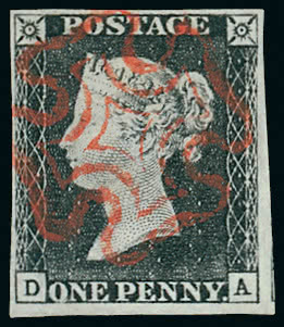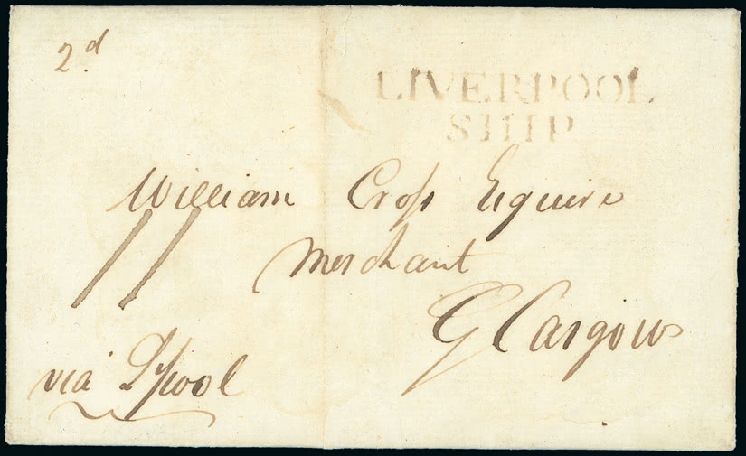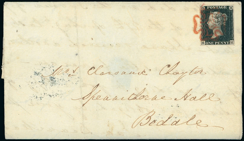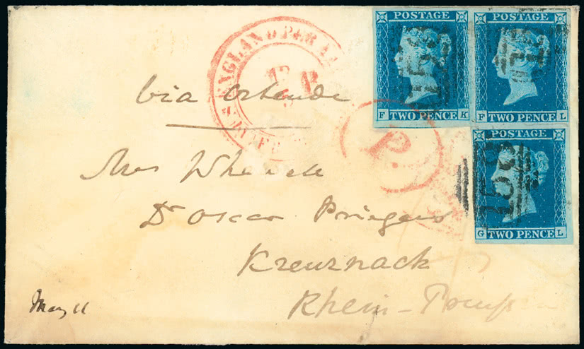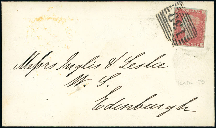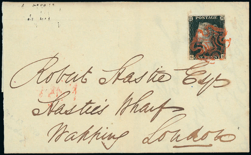 A small line-engraved selection with 1841 1d. red-brown 'black' plate 2 TC used and plate 9 JK on 1841 (Apr. 4th) entire letter used within London, 1841 1d. used on 1847 (Nov. 2nd) entire to Sleaford cancelled by two ''94'' numerals of Boston, 1d. Star on 1856 miniature envelope from London to Hertfordshire with North Western T.P.O. ''M/NR'' in circle alongside, and another on 1856 (Aug. 8th) envelope to Dublin cancelled by very scarce Birkenhead Spoon, also 1d. pink stationery envelope with fine Maltese Cross cancellation and c.1880 unaddressed visiting card envelope with two calling cards of different sizes. (7 items)