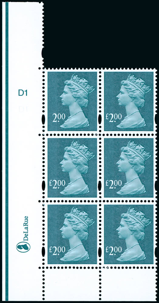 Queen Elizabeth II: Decimal Machins: High Values: 2003-05 De La Rue ATN £2 in a D1 D1 pD1 no dot cylinder block of six with [R. 18/1] missing ''£'' sign, fine unmounted mint. S.G. Spec. U491, a. Photo.