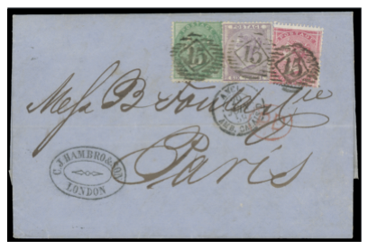 For postal historians, an attractive 1859 entire from London to Paris with a three colour franking at quadruple rate plus late fee [lot 501], featured on the front cover of the sale catalogue, reached £992. The green 1844 numeral of Denbigh cancelling an 1841 1d. on 1853 entire to Towyn. [lot 448] realised £1,674. An accidentally applied black Maltese Cross applied to an 1843 stampless entire from Carlisle to Dublin that also showed a handstruck “2” [lot 141] produce a £769 realisation.