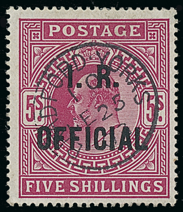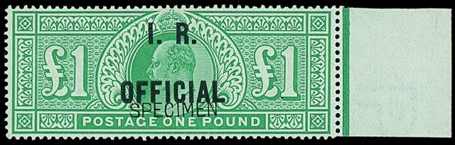 In the section of Official stamps a fine used example of the Inland Revenue 1902-04 5s. bright carmine showing the raised stop after “R” variety [lot 802] achieved an impressive £5,580. Following immediately afterward and featured on the front cover of the auction catalogue, a handsome marginal example of the £1 dull blue-green overprinted “SPECIMEN” [lot 803] also sold well, realising £6,200.