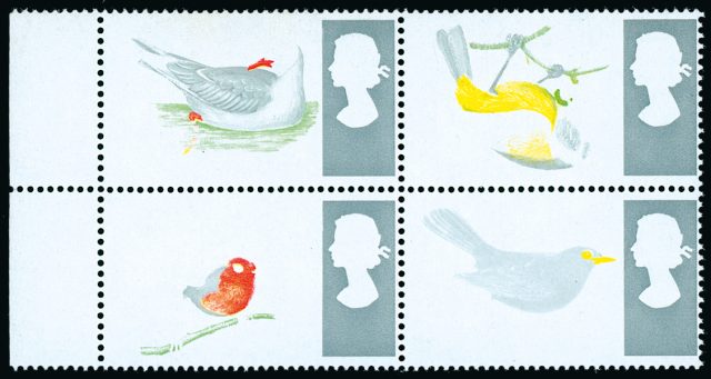 A broad offering of Queen Elizabeth II commemorative errors included the outlandish 1966 Birds 4d. se-tenant block of four missing no less than four colours [lot 1262] that achieved £6,448, the 1971 Christmas 3p. with reddish violet omitted [lot 1290] which rose to £4,320 and the 1972 Polar Explorers 3p. with lemon omitted [lot 1297] that went further, to a final price of £7,488 despite some creasing and perhaps not at all excessive if, as is thought, it is of unique status.