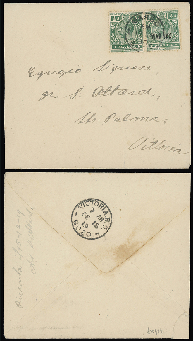 There was strong interest also in village cancellations with a 1919 cover from Garbo in Victoria [lot 1197] reaching £6,960 and the 1904 cover sent from Xeuchia to Valetta [lot 1216] soaring to £10,800.