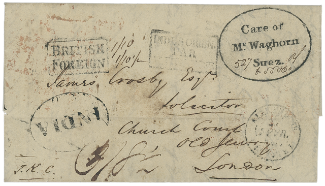 An attractive disinfected entire letter to London with markings including the framed “CALCUTTA/STEAM LETTER” datestamp, double oval “PURIFIE AU LAZARET/MALTE” and oval “Care of/Mr Waghorn/Suez” cachet [lot 286] selling for £5,400. Showing the only recorded example of the first Wavy Line cancellation on a Great Britain embossed 6d. [lot 442] produced a price of £5,040.