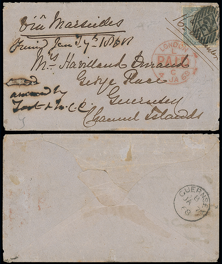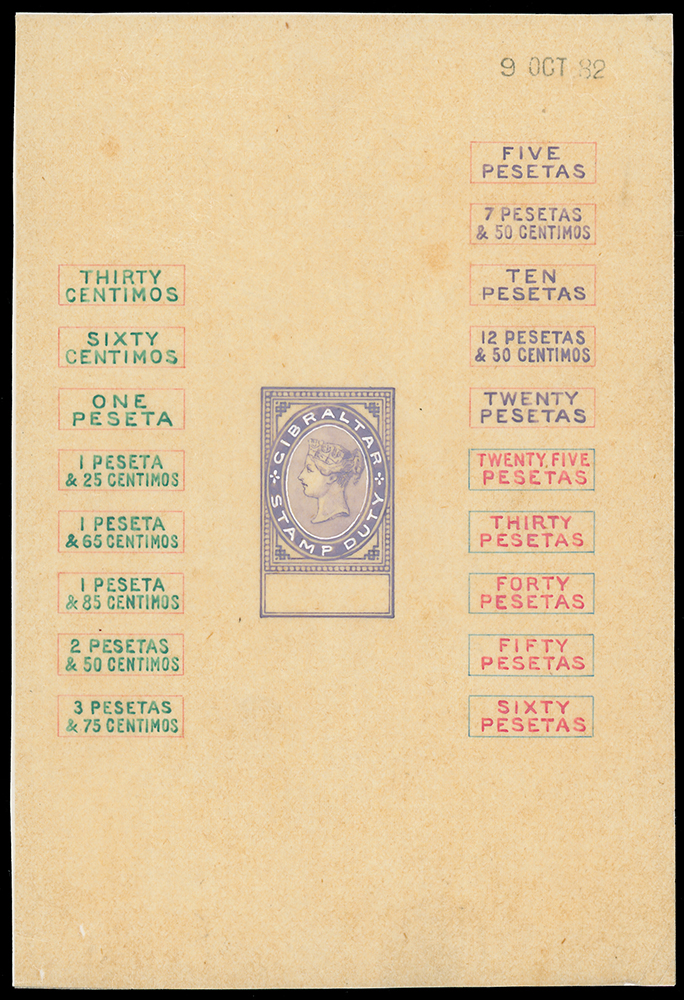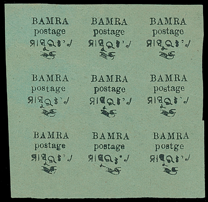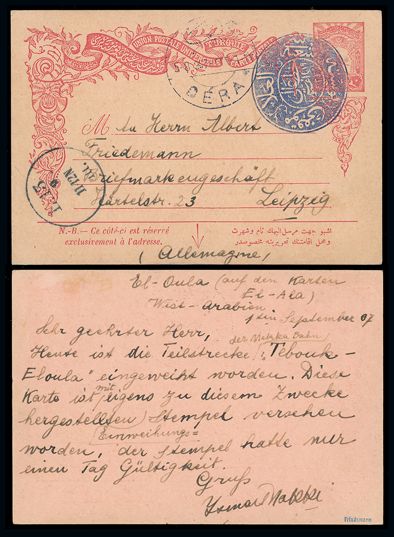 Other notable prices from this auction included the £5,688 paid for a rare cover from the 1867-68 Abyssinia Expedition, sent at officer’s rate by Brigade Major Algernon Durand to his wife at Guernsey [lot 557]. From an unusual offering of Gibraltar Revenues a hand-painted essay by De La Rue in 1882 for the Stamp Duty issue sent to the colony for approval [lot 1071] reached £3,539. From the Indian Feudatory State of Bamra an unused imperf. block of nine of the 1888 2a. black on green [lot 1164] including the “a” omitted variety reached £2,074. A postal stationery card from Saudi Arabia showing the large violet commemorative seal of El-Ula used only for one day to celebrate the completion of the railway line [lot 1955] achieved £2,480.