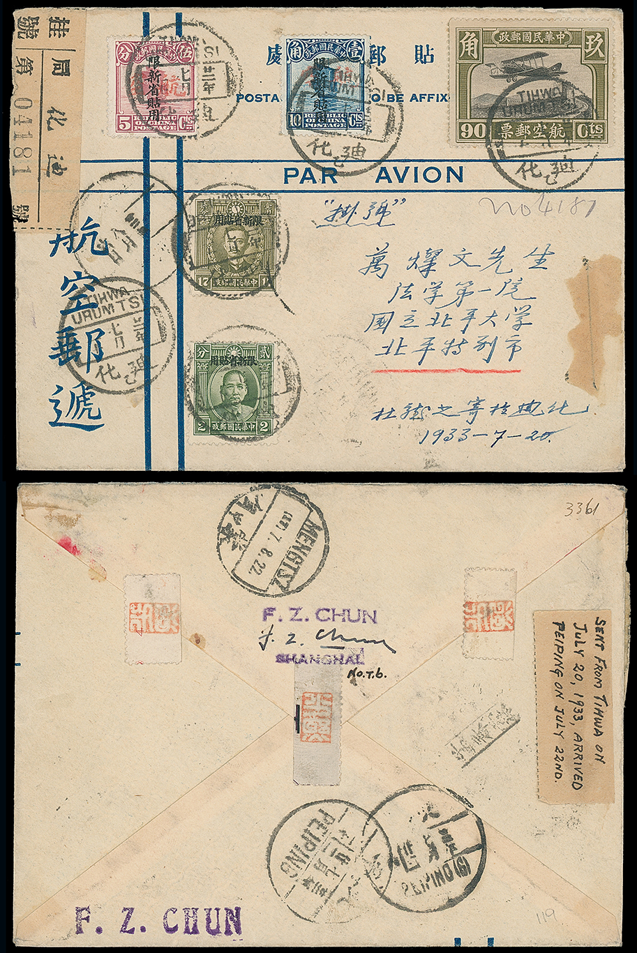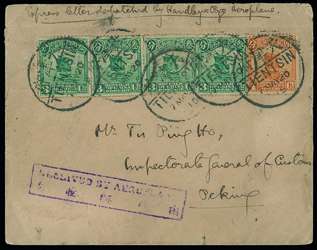 The Brian Asquith collection of Chinese Airmails was one of several sections of lots to impress in the British Empire & Foreign Countries auction on December 3rd-4th. Appearing on the front cover of the catalogue, the characterful cover from the 1920 (May 7) Tientsin to Peking flight “by Handley-Page Aeroplane” [lot 449] rose to £5,490 whilst an attractive registered cover from the 1933 (July 20) flight from Tihwa to Peiping [lot 489] soared to £2,135.