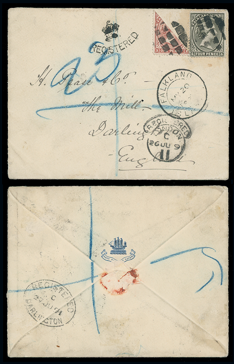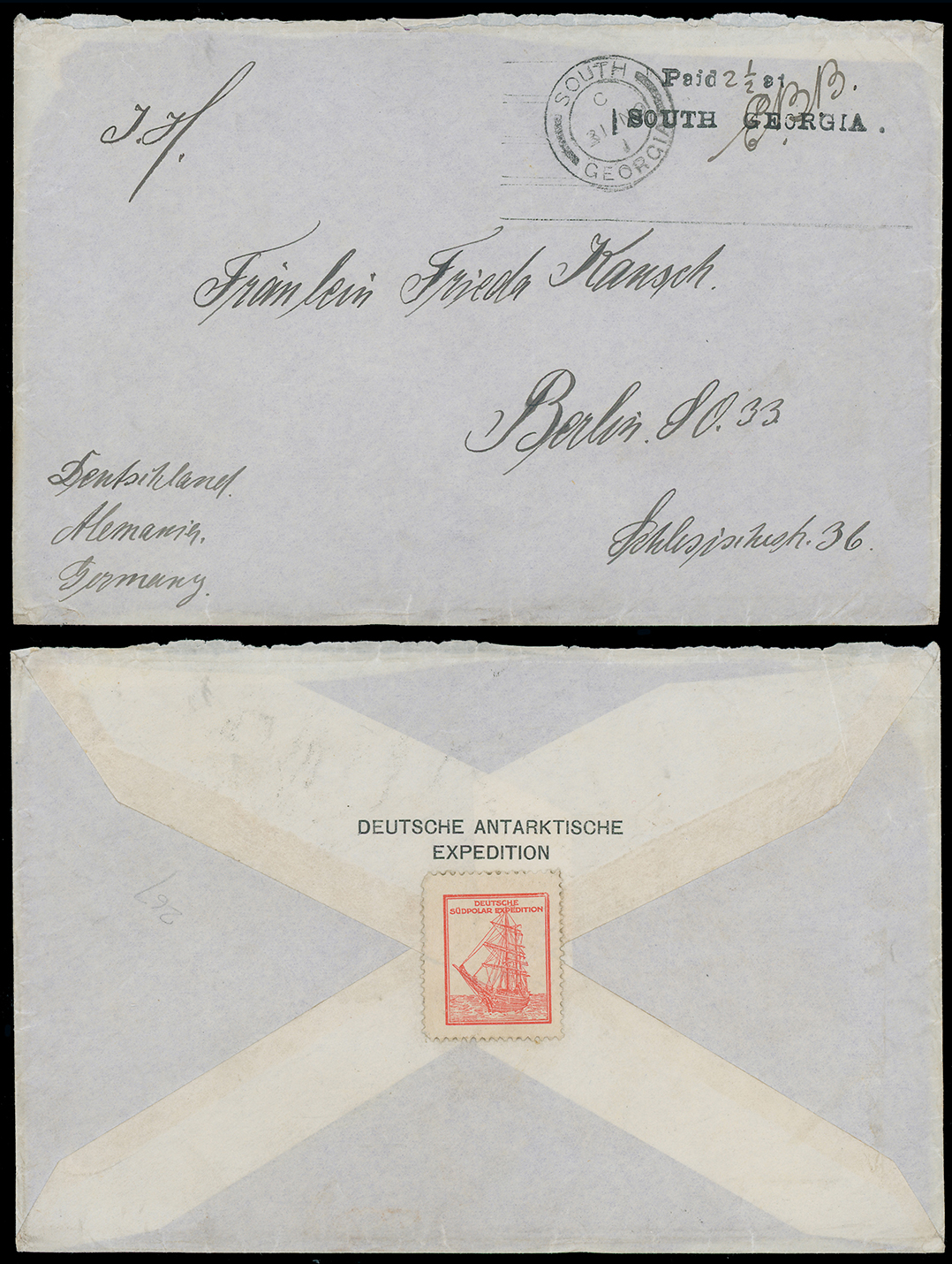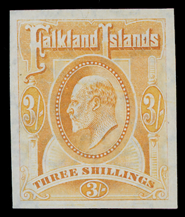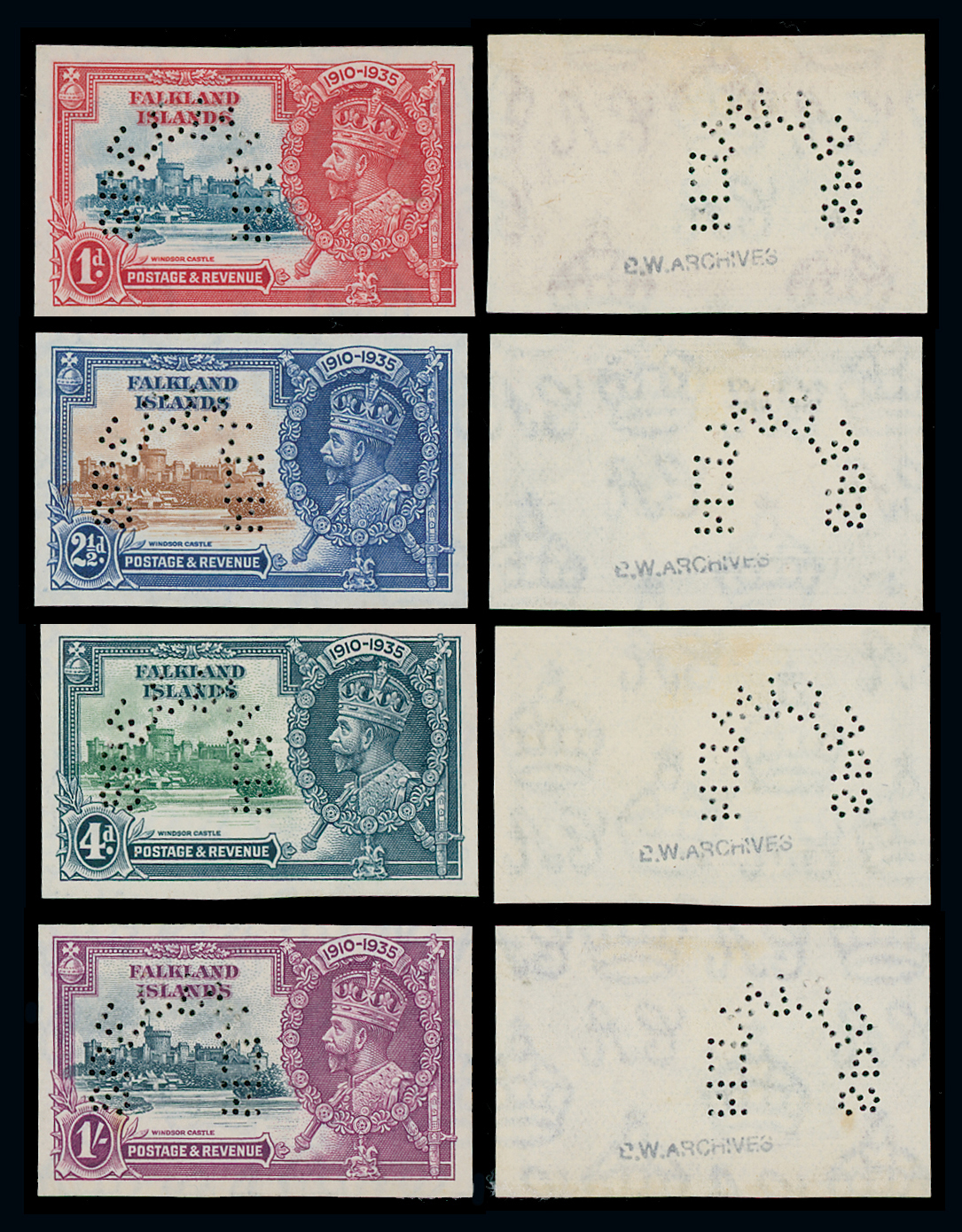 From the 1891 Bisect Provisionals, a registered cover from the Seventh Mail [lot 596] reached £3,100. Another cover showing the rare provisional “Paid at/SOUTH GEORGIA” handstamp with handwritten “2½” (d.) value [lot 915] achieved £5,400. There was a strong presence of proof and specimen material, generally well received, with particularly strong results from the the King Edward VII period including £1,736 paid for the 3s. colour trial in yellow [lot 621]. Star lot was a unique item, the archival 1935 Silver Jubilee set, imperf. and with “SPECIMEN” perfin [lot 733] contested to an exceptional price of £13,640.
